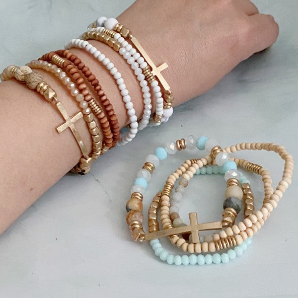 This 4-piece set of beaded stretch bracelets adds a stylish, statement-making touch to any look. Crafted with natural stone and wooden beads and featuring a sided cross, these boho-glam accessories are perfect for any occasion.