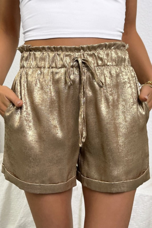 Flip into luxury with these show-stopping metallic shorts! Crafted from premium opulent fabric in a lustrous gold finish, they feature a playful frilled waistline and perfectly cuffed hem for that polished edge. The drawstring elastic waist ensures comfort while you move, making them ideal for everything from casual outings to elevated evening looks. Pair with a crisp tee for effortless sophistication, or dress them up for your next celebration. These aren't just shorts, they're your ticket to turning heads. 100% Polyester