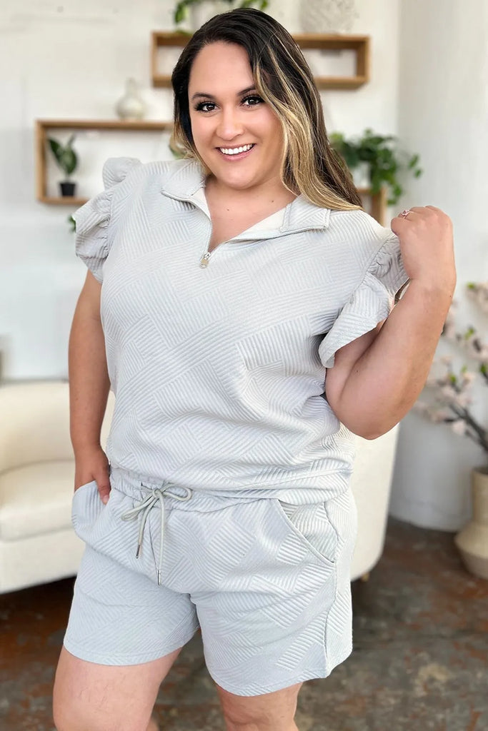 Double Take Full Size Texture Flounce Sleeve Top and Drawstring Shorts Set