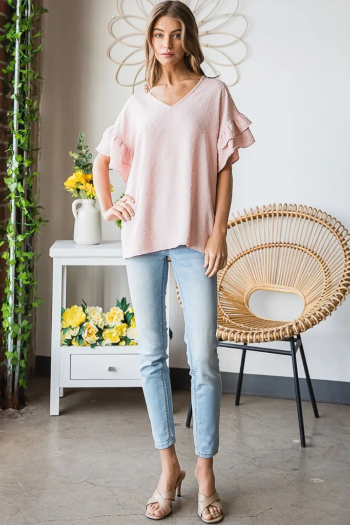 Heimish Full Size Swiss Dot Ruffle Short Sleeve Top