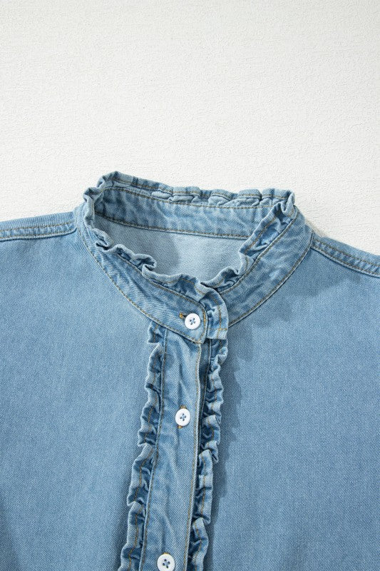 Embrace your adorable side in this charming denim mini dress! Delicate frills frame the neckline while ruffled short sleeves add a graceful, feminine flair. The convenient button-down front makes getting dressed effortless, and practical side pockets keep your essentials close. Perfect for casual days when you want to look cute and feel comfortable, this shift silhouette flatters every figure with its relaxed, breezy fit. Cotton/Polyester