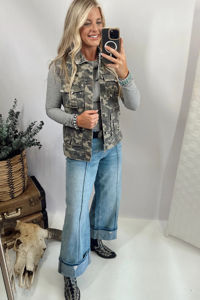 • This camo denim vest is perfect to make a chic statement.