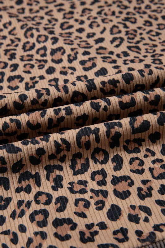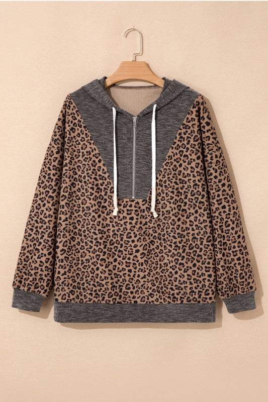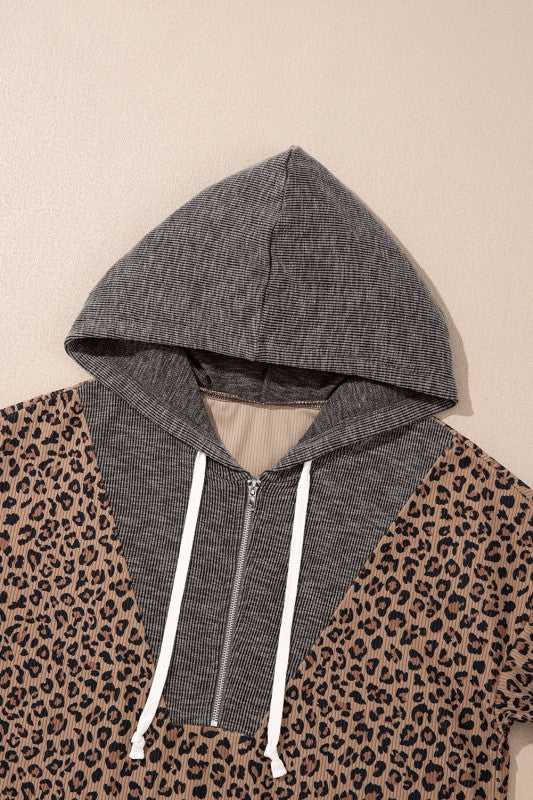 Leopard Ribbed Knit Contrast Half-Zip Hoodie