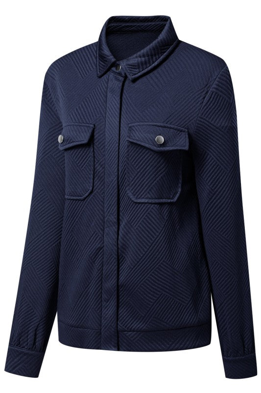 Level up your layering with this sleek blackish-green jacket that's your new go-to for instant polish! The classic turn-down collar brings timeless sophistication, while the convenient zip-up front and dual button flap pockets keep things functional and fun. Crafted from quality fabric with just the right amount of stretch, this shacket moves with you while maintaining its shape. The solid color makes mixing and matching a breeze, so you can pair it with literally everything in your closet for endless outfit possibilities! Polyester/Spandex