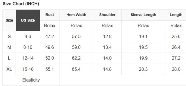 See size chart for approximate measurements