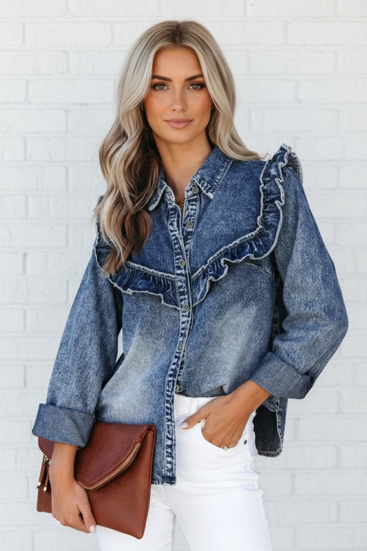 Step into effortless style with this denim shirt that perfectly blends vintage charm with modern flair. The soft, worn-in wash gives it that coveted lived-in look, while delicate ruffles add a playful feminine edge. Crafted from quality denim, it's your go-to piece for casual days and dressed-up moments alike. Button down for easy layering and all-day comfort that actually lasts. 100% Cotton