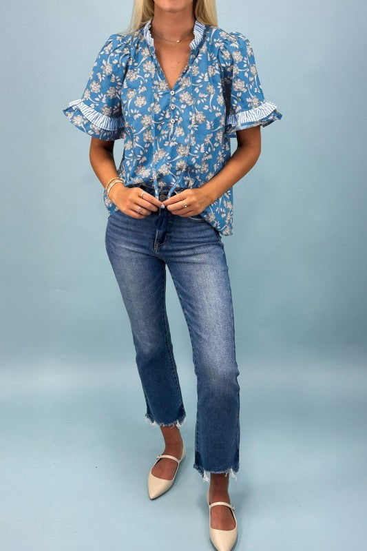 Bloom into summer style with this charming floral blouse that's equal parts chic and comfortable. The split V-neck with half-button closure pairs perfectly with striped detailing for a modern twist on classic florals. Ruffled short sleeves add a touch of feminine grace, while the lightweight fabric keeps you cool and breezy all day long. Perfect for casual outings, weekend brunches, or lazy afternoons, this is the blouse that does it all without trying too hard. 100% Cotton