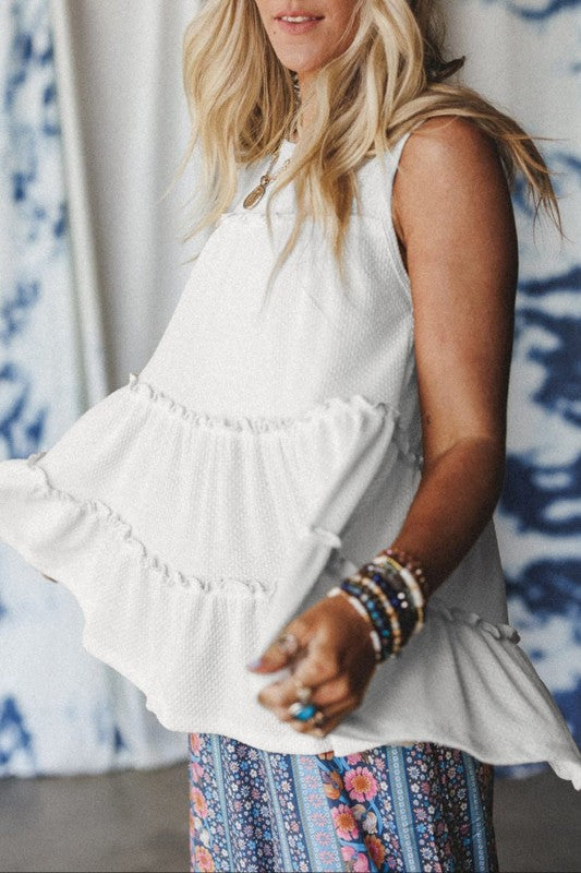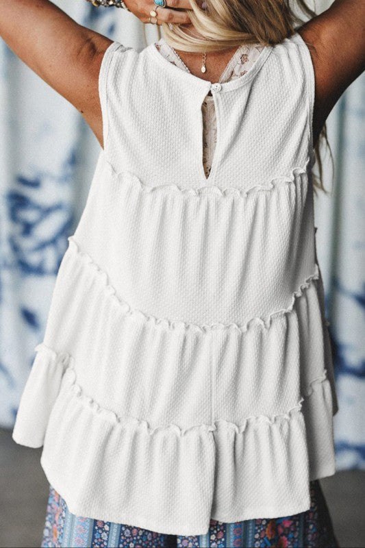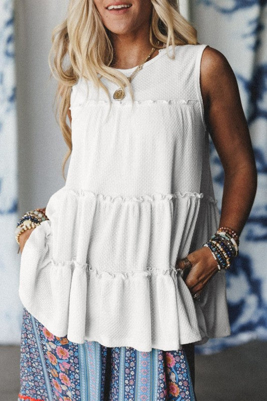 Embrace effortless style with this charming tank top, featuring delicate frill trim that adds a flirty touch to your everyday wardrobe. The flattering A-line silhouette works beautifully on every body type, while the lightweight fabric keeps you breezy and comfortable through warm weather. Layer it over your favorite tee or slip dress, or rock it solo for an easy, put-together vibe that feels both fun and polished. Polyester/Spandex