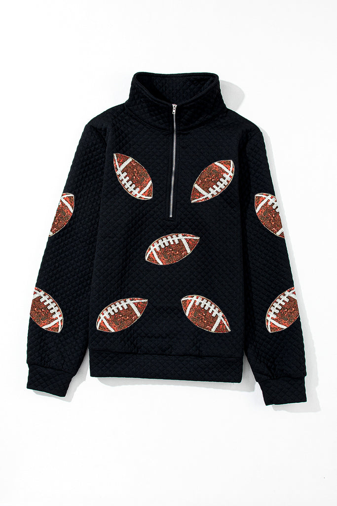 Black Sequin Rugby Football Patched Quarter Zip Textured Sweatshirt